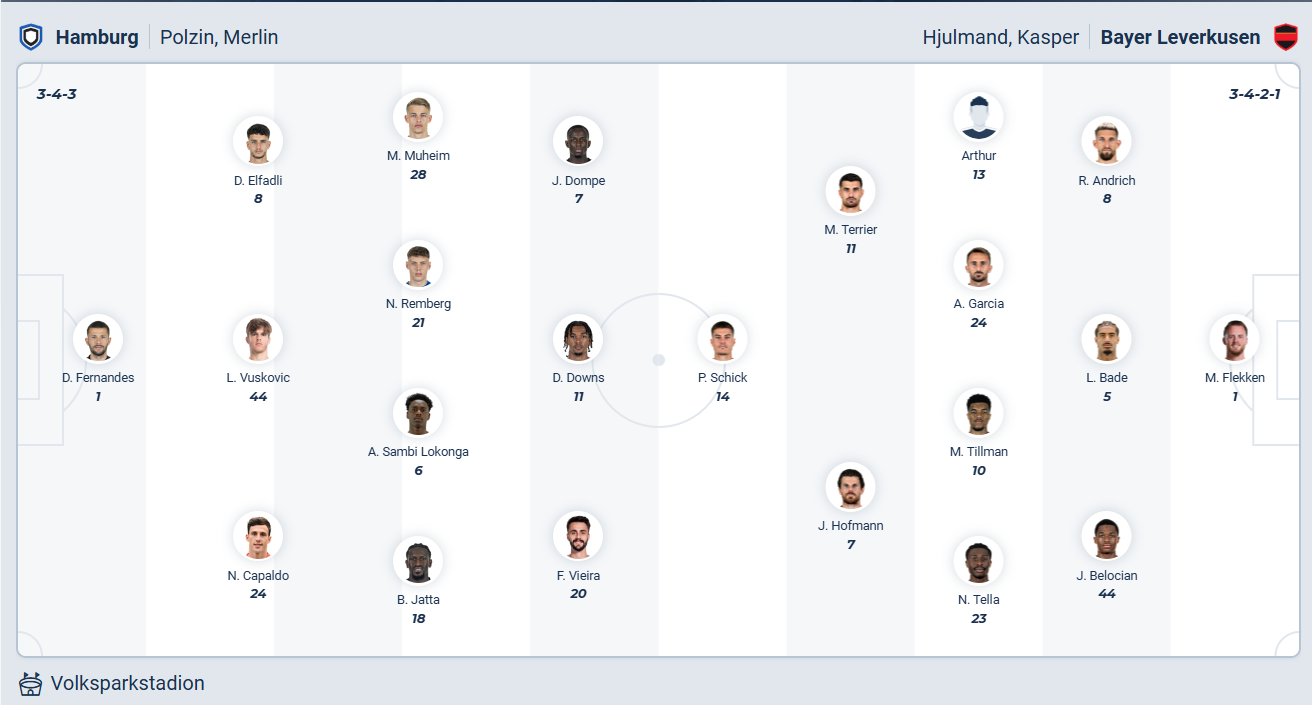 Leverkusen đang đứng thứ 3 trên bảng xếp hạng, vị trí không đến nỗi nào với họ ở thời điểm này bởi đội hình năm nay đã mất nhiều trụ cột so với mùa giải trước. Đội bóng của HLV Kasper Hjulmand đang kém 2 đội đầu bảng số điểm khá lớn và để các đội phía sau bám rất sát nên họ cần chơi tốt ở các trận đấu sắp tới để giữ vị trí của mình. Các cầu thủ Leverkusen đặt mục tiêu giành chiến thắng khi đến làm khách trên sân của Hamburg và trước đối thủ mới thăng hạng thì nhiều khả năng họ sẽ không gặp nhiều khó khăn để ra về với 3 điểm trọn vẹn.